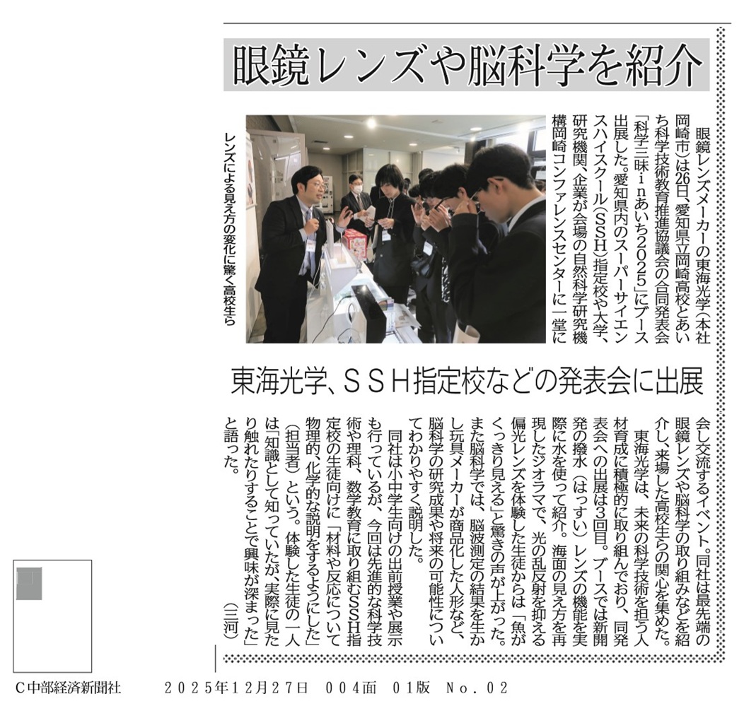 東海光学、SSH指定校などの発表会に出展東海光学は、自然科学研究機構岡崎コンファレンスセンターにて開催された、愛知県立岡崎高校とあいち科学技術教育推進協議会の合同発表会「科学三昧inあいち2025」にブース出展いたしました。最先端の眼鏡レンズや脳科学の取り組みなどを紹介し、来場した高校生の関心を集めました。これからも地域の教育活動に積極的に参加し、若い世代の学びを応援していきます。 |